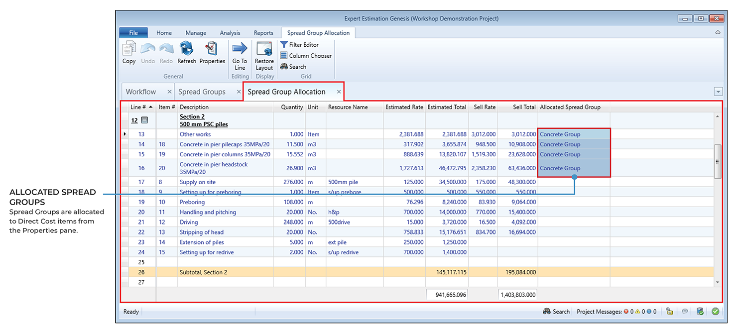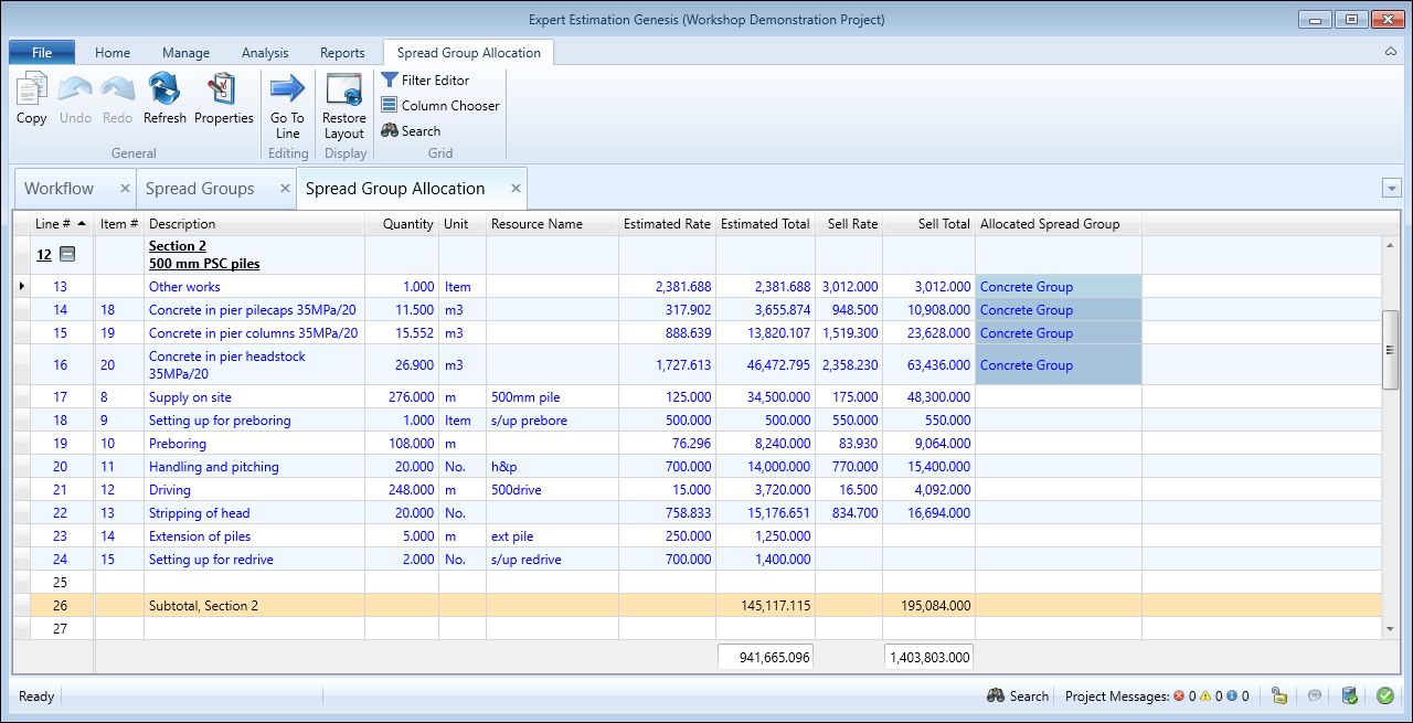 Once a Spread Group has been created, they need to be allocated. The Spread Group Allocations window provides you with an area to assign the Spread Groups within the project to your Direct Cost Schedule items.