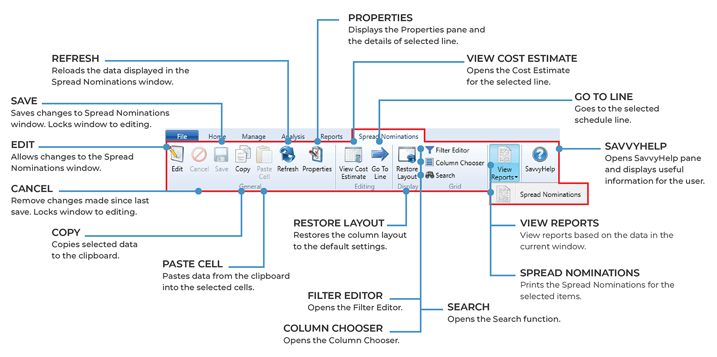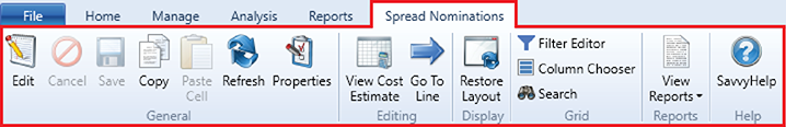 The contextual ribbon toolbar for the Spread Nominations window gives you access to the specific functions that help you manage the distribution of additional value to contributing Direct Cost Items.