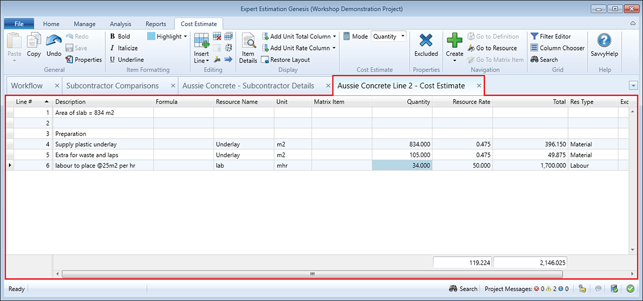 Building up costs in the Item Cost Estimate window is the same as any other Cost Estimate within the program. Unlike the Independent Cost Estimates, resources used in the Item Cost Estimates will contribute to the project’s overall resource usage, if the specific subcontractor is marked as selected.
