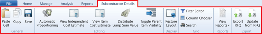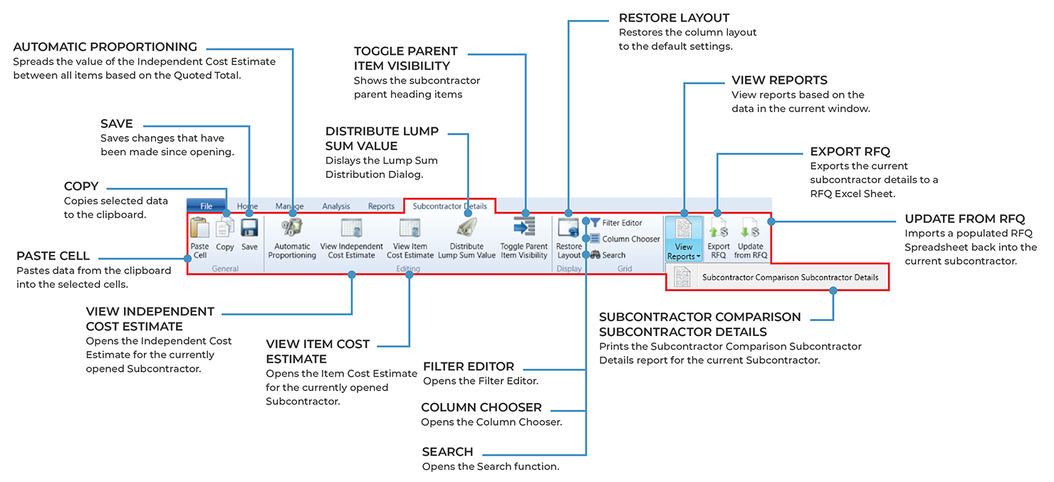 Subcontractor Comparisons – Subcontractor Details – Ribbon Toolbar
