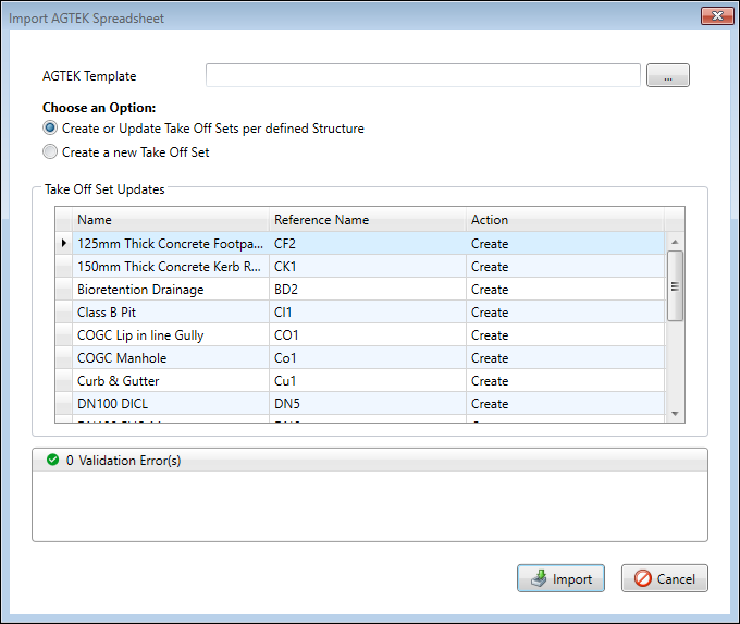 AGTEK Import with Create or Update Take Off Sets as per defined structure option selected