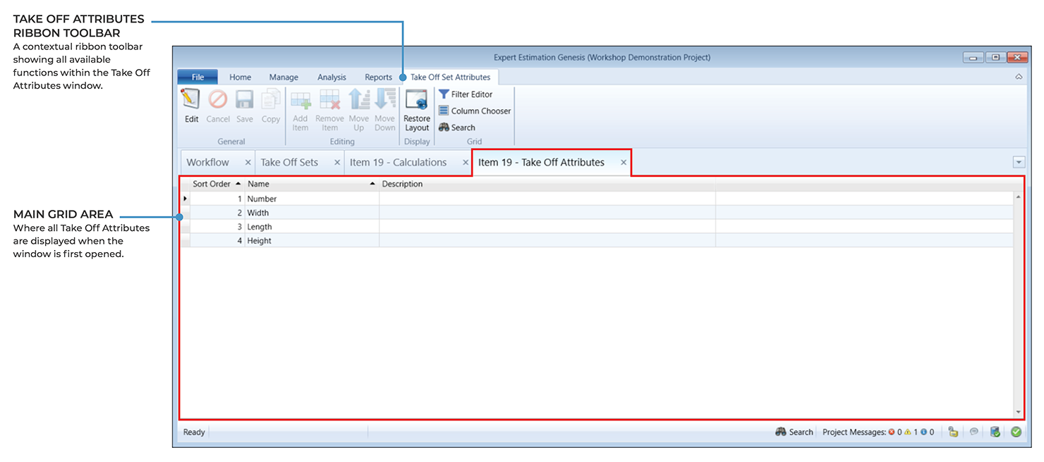 Take Off Attributes are used in the Take Off Calculations window as multipliers to calculate a total value for a Take Off Calculation line. These attributes are usually identified as a type of measurements such as height, width or length.
